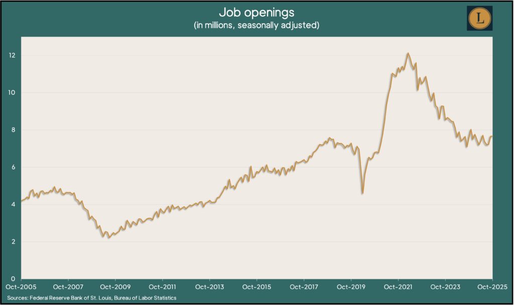 Employers’ appetite for new workers rose in September and then only slightly in October, according to a delayed job openings report from the Bureau of Labor Statistics. Openings reached nearly 7.7 million in October, down 36% from the peak of 12.1 million in March 2022, but still above pre-pandemic levels. The report combined new data from September and October and was one week later than usual because of the federal government’s 43-day shutdown. The rate and number of workers quitting their jobs – a sign of worker confidence – dipped to their lowest levels since the early months of the pandemic. They have been below pre-COVID levels since the end of 2023.