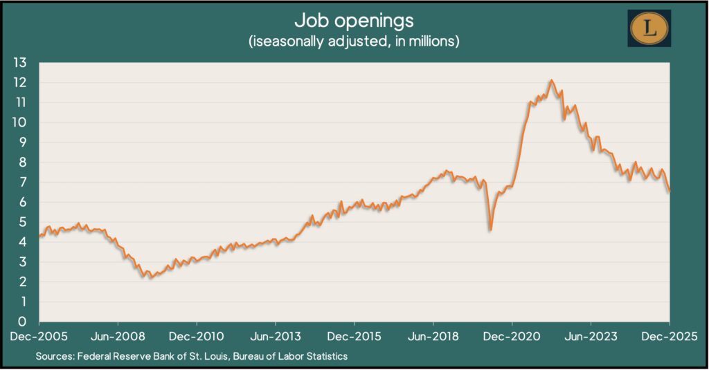 And while employers appear reluctant to dismiss workers, the number of job openings dropped in December to the lowest level since the pandemic. The Bureau of Labor Statistics counted 6.5 million openings in December, down from a record 12.1 million in March 2022 and below the pre-pandemic mark for the first time since September 2020. The number and rate of worker quitting their jobs — a measure of worker confidence — have stayed below pre-pandemic levels since the end of 2023.