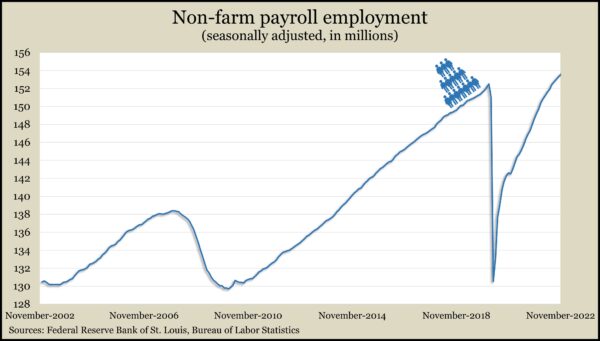 U.S. employers added 223,000 jobs in December, lower than the monthly average for 2022 (375,000) and 2021 (562,000), but still a sign of a steady labor market. The leisure and hospitality industry led in hiring, according to the Bureau of Labor Statistics, though it’s still more than 900,000 jobs (5.5%) shy of its mark just before the pandemic. Meanwhile, total employment edged 0.8% or 1.2 million jobs higher than in February 2020. Temporary help jobs – often a harbinger of overall hiring trends – fell for the fifth month in a row. The average hourly wage rose 4.6% from December 2021, the latest in a decline from a recent peak of 5.6% in May. The same report showed the unemployment rate dropping to 3.5% – the same as its mark at the outset of the pandemic.