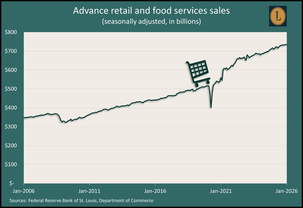 Retail sales declined in January as seven of 13 categories reported lower revenue, the Commerce Department reported. Gas stations were among the decliners, reflecting lower gas prices in January. But sales at bars and restaurants, an indicator of consumer confidence, fell for the third time in four months. Consumer spending drives about 70% of the U.S. economy, as measured by gross domestic product. Adjusted for inflation, total retail sales dropped for at least the second month in a row. Inflation data for October and November are missing because of a federal government shutdown.