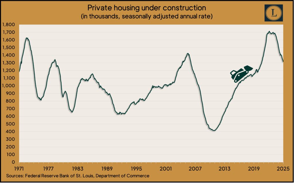 Rates of housing starts and building permits continued to slide in August, according to the Commerce Department. The annual pace of starts dropped nearly 8.5% from July and was off 6% from the year before, with critical single-family structures down nearly 12% from August 2024. For the 17th straight month, housing starts lagged the level set just before the COVID-19 pandemic, which was the fastest pace of building since late 2006. Meanwhile, permits – an indication of future housing construction – declined to the lowest level since May 2020, down almost 4% from July and 11% lower than August 2024. The pace of houses under construction continued falling from its all-time peak two years ago.