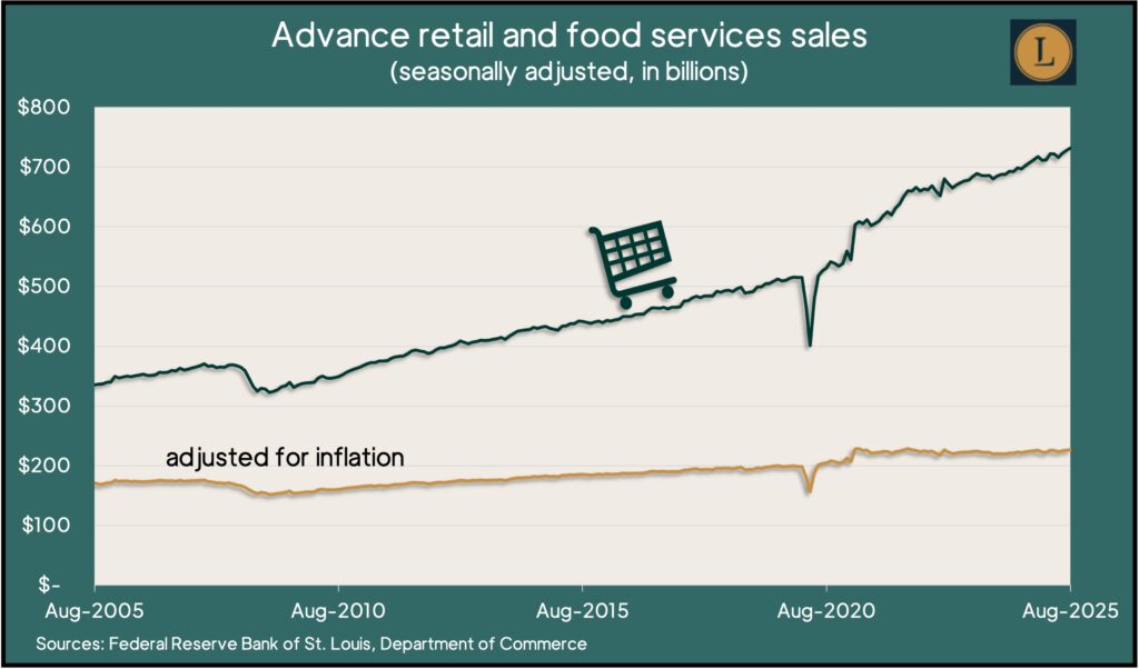 In a sign of consumer spending resilience, the Commerce Department reported a 0.6% rise in retail sales in August. Sales fell in only four of 13 categories: Furniture stores, health-and-beauty centers, general merchandisers and miscellaneous retailers. Gainers were led by a 2% increase from online retailers. Excluding sales at car dealers and gas stations, retail revenue grew 0.7%. Adjusted for inflation, total retail sales rose 0.2% in August.